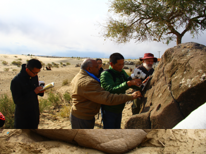 The weather was just like that in winter, so everyone put on more clothes and hat. When we reached the site, Dahei Mountain, we barely to stand due to strong wind with grains of sand. A decade ago, I led some TV reporters to be here to make a record, but because of the severe weather, the camera got struck. As a result, we returned without accomplishing anything. This was the first time that Mr. Robert and Mr. Kumar were confronted with such weather, but as scientists, they never retreated but marched on. Fearing that Mr. Robert fell down, I tried to support him with my hands, but he insisted to climbed the mountain himself just like a young man. His temperament and character was pertinent to his four decades of rock art field study, which drew everyone’s applause for his strong physique. When the experts eventually saw the fish pattern with human face on the cliff, they observed it for a long time. To our disappointment, the dark cloud were rolling in the west, indicating that it was going to rain and snow at once, so I reminded everybody to pack their equipment to go downhill. Not surprisingly, the moment we went into the car, it began to rain and snow. At that time, Professor Tang told me that my prediction was right, otherwise we would be in much trouble due to the darkness and slippery road.