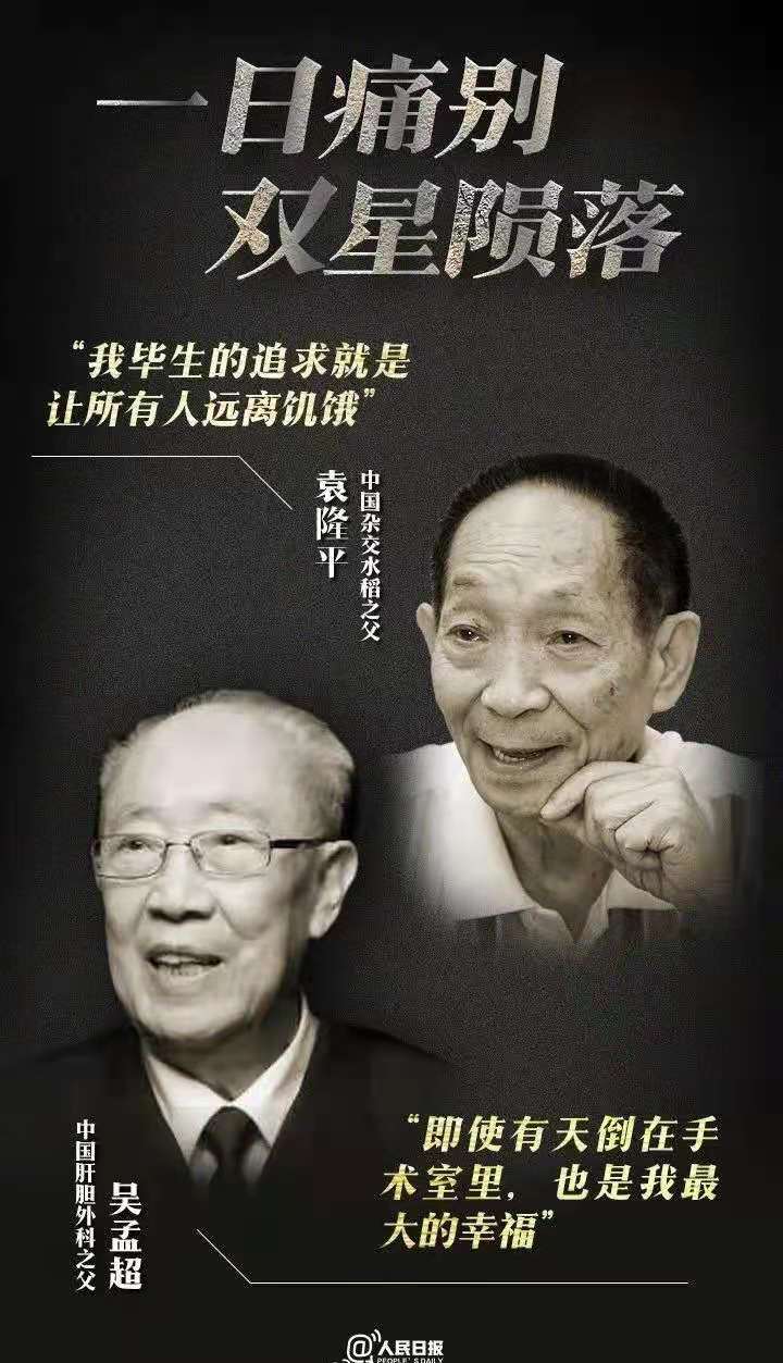 一天之內,吳孟超院士與袁隆平院士先后辭世。“雙星”隕落,國人同悼。在互聯網上,在微雨街頭,在大學校園,人們不約而同獻上敬意與哀思。