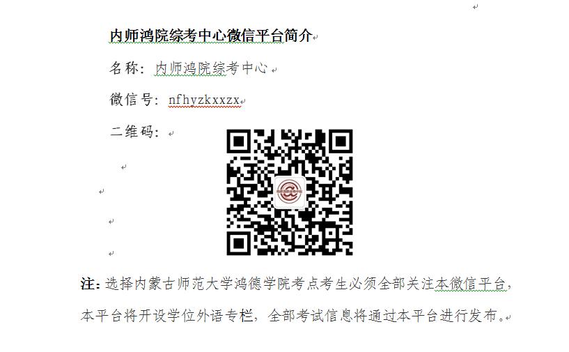 5、以上通知事宜均已通過報名網站進行提示、內蒙古師范大學鴻德學院教務處網站、【內師鴻院綜考中心】微信平臺進行通知。選擇內蒙古師范大學鴻德學院考點參加考試的考生請務必關注【內師鴻院綜考中心】微信平臺,隨時關注考點發出的相關通知,確保考試順利進行。