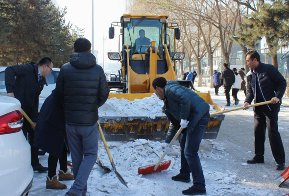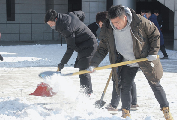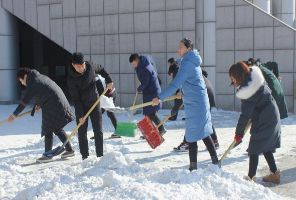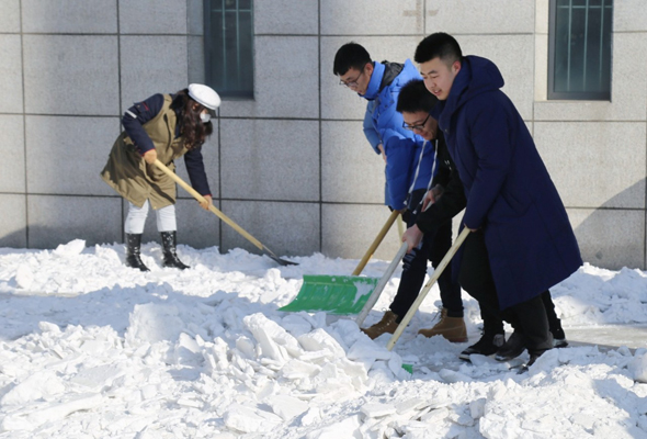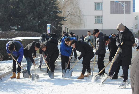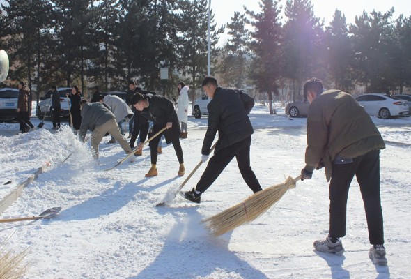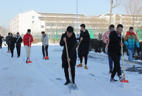 中午12:30,師生們帶著鏟雪工具在崇德樓前集合,分工之后便積極投入到鏟雪活動中。大家手拿掃帚和鐵鍬,冒著嚴寒,齊心協力,經過近兩個小時的努力,校園主干道的積雪基本被清理完畢,師生們通行方便了很多。