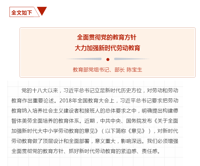 教育部部長陳寶生:全面貫徹黨的教育方針、大力加強新時代勞動教育