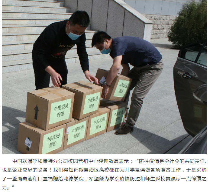 中國(guó)聯(lián)通呼和浩特分公司向內(nèi)師大鴻德學(xué)院捐贈(zèng)防疫物資