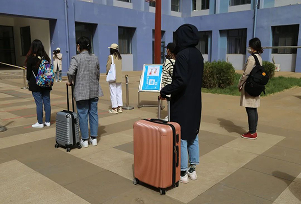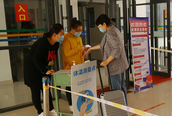入校學生陸續從校門口進入宿舍區,在每棟宿舍樓門口要再次進行身份核驗和體溫測量,體溫正常者方可進入宿舍樓。