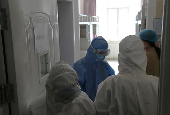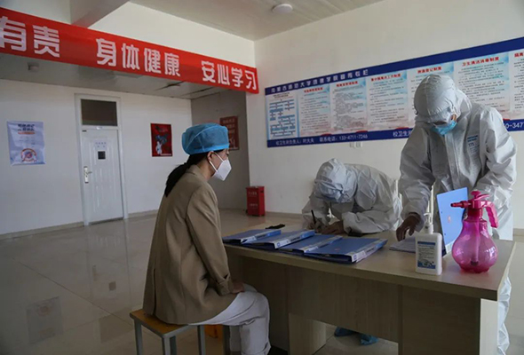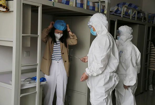 在宿舍,一名學生出現發熱癥狀,本人和宿舍同學立即打電話報告班主任和學院防疫值班人員。聞訊趕來的防疫人員立即對學生進行體溫檢測和防疫處置,之后將發熱學生帶至隔離區做進一步診斷。