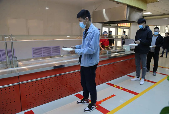 餐廳外設置了等候區,進入餐廳后要先洗手消毒,然后沿地面標示線到打餐窗口。就餐時要一人一桌、同向就坐。學院建議同學們打包帶回宿舍食用,盡量減少在餐廳停留的時間。就餐完的同學要按照地標指示,從出口處走出餐廳。