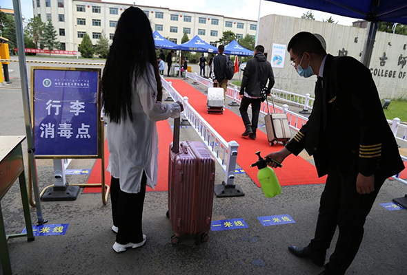 5月26日,內蒙古師范大學鴻德學院迎來第一批返校學生。學院各部門分工協作、密切配合,嚴格按照學院開學疫情防控的相關要求做好各項工作。返校學生認真按照學院要求從專用通道進入,行李消毒、足底消殺、核驗身份、測量體溫、更換口罩等流程之后進入校園。