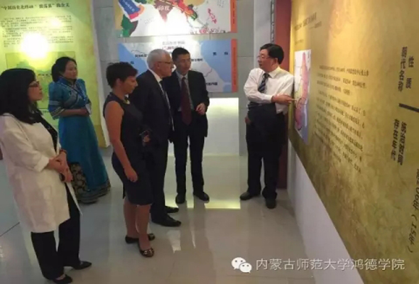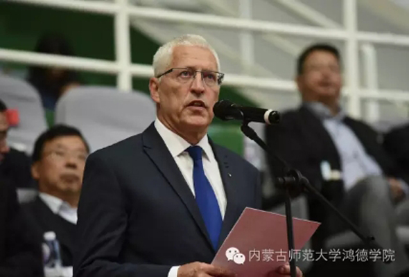 9月20日上午,內蒙古師范大學鴻德學院2016級新生開學典禮暨表彰大會隆重舉行。英國特蘭米爾流浪者足球俱樂部主席馬克·帕里奧斯先生攜夫人妮古·拉女士應邀出席。