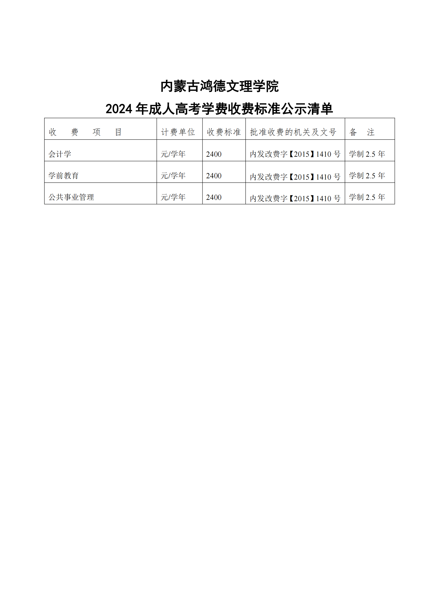 內(nèi)蒙古鴻德文理學(xué)院2024年成人高考學(xué)費(fèi)收費(fèi)標(biāo)準(zhǔn)公示清單