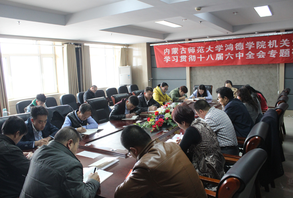 11月1日上午,內蒙古師范大學鴻德學院機關黨支部學習貫徹十八屆六中全會專題研討會在崇德樓第二會議室召開。機關黨支部書記、學生處副處長周玉森主持會議,全體機關黨支部成員參會。