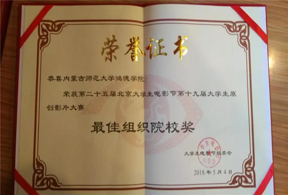 今天,繼去年之后又一次摘得了北京大學生電影節最佳組織院校獎,再次蟬聯這一殊榮,體現出了我院廣播電視編導專業在學生專業人才培養方面的顯著成果。此次獲獎極大地調動了學生的積極性,也將大大提升內蒙古師范大學鴻德學院在全國影視類院校中的影響力和美譽度。