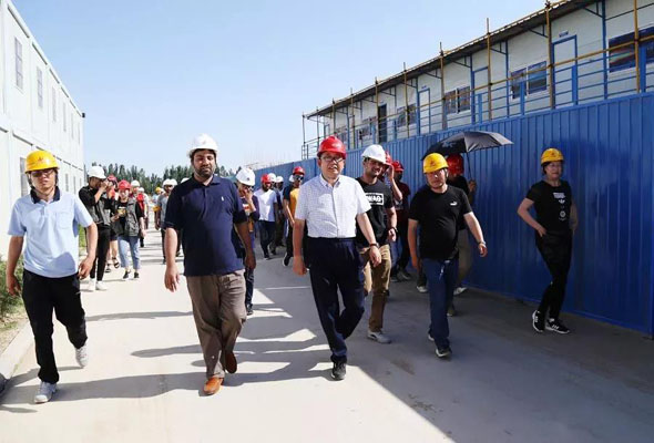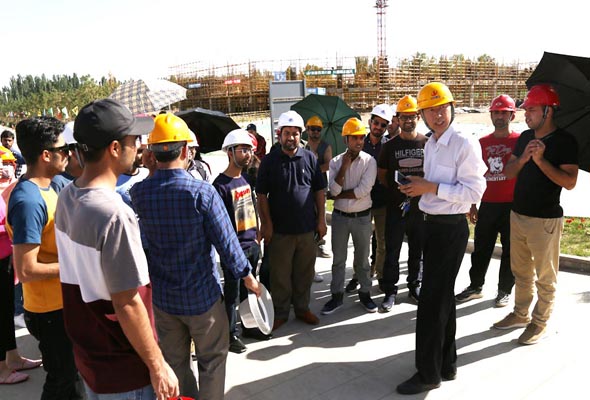 留學生們小心穿梭在鋼筋混凝土組成的施工架構中,緊跟著周院長、老師和工人師傅的步伐,聆聽周院長的講授,目光也時時隨著周院長所講授的地方而移動。雖然語言不同,但這并不能影響留學生們對學習的積極與熱情。周院長和留學生們談道:四十年前中國的經濟遠遠不及巴基斯坦的經濟,然而在短短的四十年里,中國的經濟快速發展,并且超過巴基斯坦。中國經濟之所以飛速發展,正是因為中國人有著奮發圖強、鍥而不舍的精神。周院長對留學生抱以殷切希望,希望他們在學習上也要有奮發圖強的精神,刻苦鉆研學術,從而創造佳績。隨后在參觀學習施工現場途中,遇到很多忙碌在工作崗位上的女性工人,周院長對留學生們講到,中國男女的地位是平等的,沒有什么職業要對性別有限制。留學生們聽后紛紛點頭表示贊同