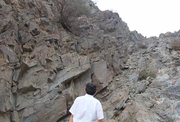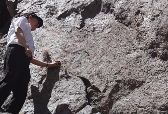 周玉樹院長擔任此次考察的領隊人,所到之處都會為隨隊人員耐心講解,向大家分享他對三皇體系的產生、發(fā)展和傳承,并與陪同的專家、學者進行了交流。吳甲才老師在踏查過程中就地取材,通過不斷的鑿刻、研磨制作了一幅仿古代巖畫并對相關刻磨方法進行了實驗研究。由于所走過的路都是陡峭的巖壁,周院長一行人不辭辛苦,頂著烈日炎炎的天氣,帶著簡單的食物,在山上一呆就是一天,條件極為艱苦。