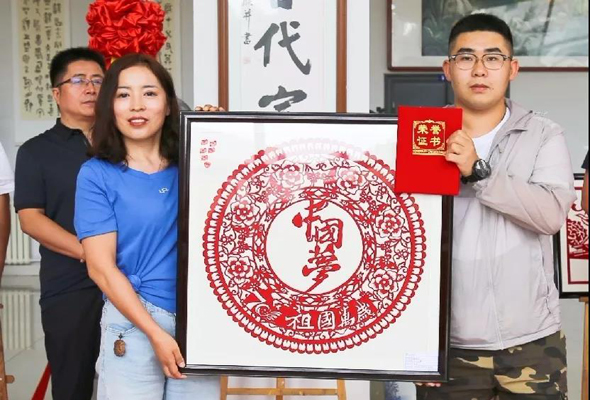 開幕式結束后,開展了優秀作品評比活動,參觀者用現場投票的方式評選出了優秀作品。蘆一帆的作品《我和我的祖國》榮獲一等獎,王曦田的作品《心中的太陽》榮獲二等獎,銀艷兵的作品《中國夢》榮獲三等獎。非遺傳承人崔霞、學院黨委書記盧鳳龍、辦公室主任張玉恒為獲獎學生頒獎。