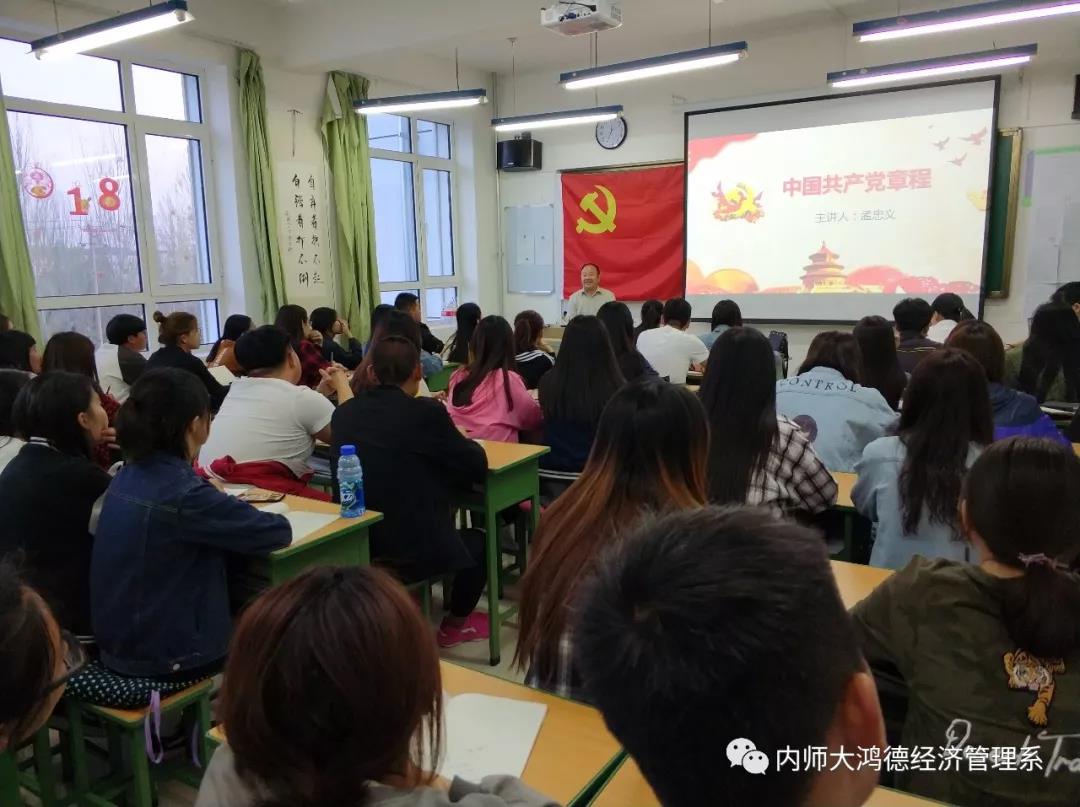 以黨的十九大會議精神為指導,深入推進經濟管理系學生黨建工作組織化、制度化、具體化,培養造就一批守信念、重品行、有本領、敢擔當的馬克思主義者和德才兼備的拔尖創新人才,引導他們成長為中國特色社會主義事業的合格建設者和可靠接班人,經濟管理系于2018年4月18日在天健樓305舉辦2018年第一期入黨積極分子培訓班。此次入黨積極分子培訓班的主講人是經濟管理系黨支部書記孟忠義書記。
