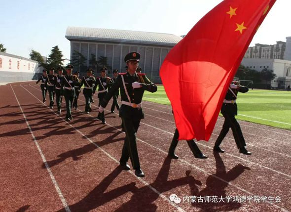 儀式第二項:進行軍訓(xùn)成果表演。第1項:迎校旗。第2項:分列式會操表演。第3項:軍體拳表演。