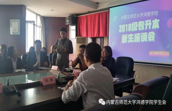 工作動態(tài)/ LATEST NEWS2018年9月13日下午,2018級專升本新生座談會于內(nèi)蒙古師范大學(xué)鴻德學(xué)院崇德樓第一會議室進(jìn)行。參加本次座談會的領(lǐng)導(dǎo)有:教務(wù)處處長郝敏、科長于萍、徐靜,學(xué)生處處長任鳳桃、周玉森,學(xué)生管理科科長白曉童、祁文強(qiáng),生活管理科科長平士奇,總務(wù)處科長張騫,以及各系學(xué)管老師,同時(shí)還有各系18級各系專升本代表。