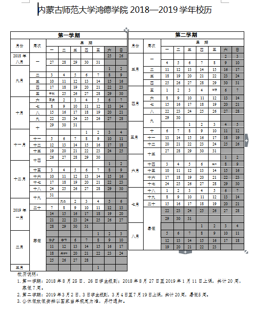 內蒙古師范大學鴻德學院2018—2019學年校歷